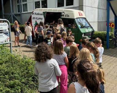 Am vorletzten Schultag strömten alle Schülerinnen und Schüler auf den Pausenhof, da dort der Eiswagen der Gondelsheimer Eisdiele auf die Kinder und Lehrerinnen wartete. Der Förderverein, mit den neu gewählten Vorständen, hatte sich diese tolle Überraschung zum Schuljahresabschluss überlegt und alle freuten sich riesig über die leckere Erfrischung.