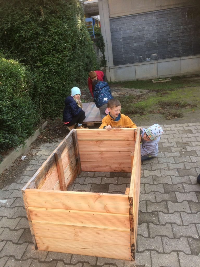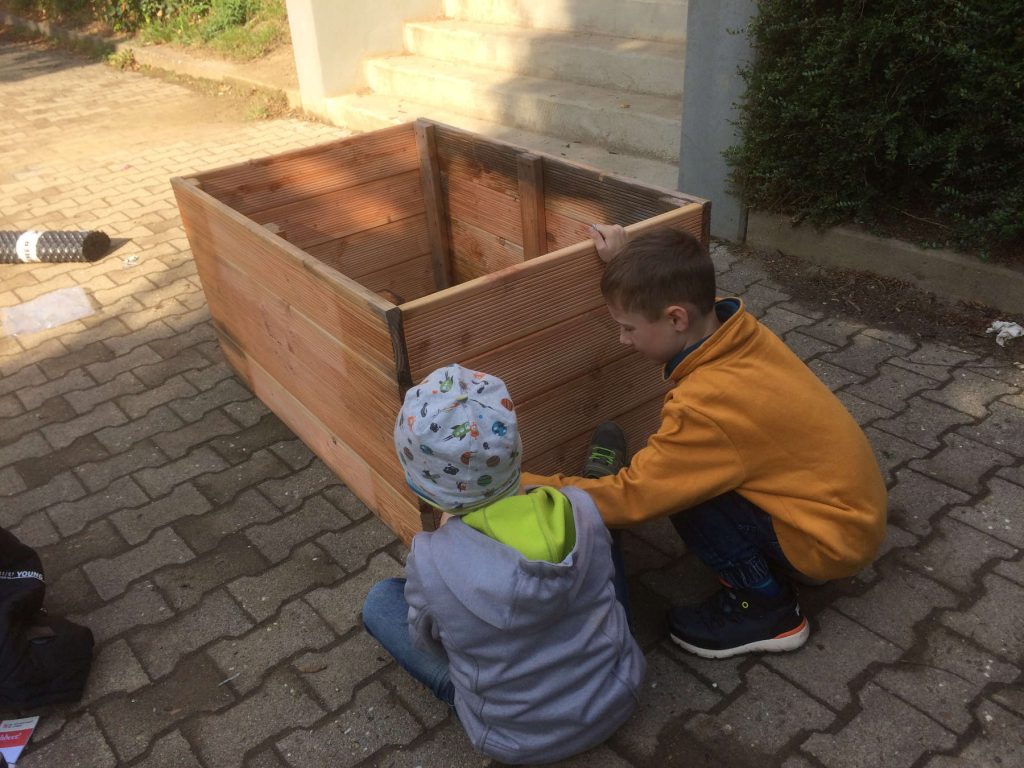 Von fleißigen Drittklässlern wurde so in dieser Oktoberwoche erst alles an den vorgesehenen Platz getragen, dann aufgebaut. Wer wollte durfte selbst die Löcher vorbohren und die Schrauben mit dem Akkuschrauber festziehen. Nach 1,5 Stunden Teamwork stand das Hochbeet!