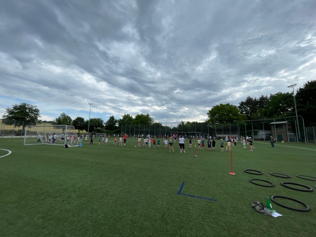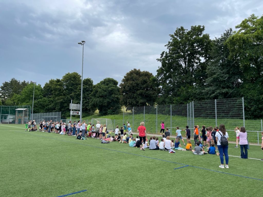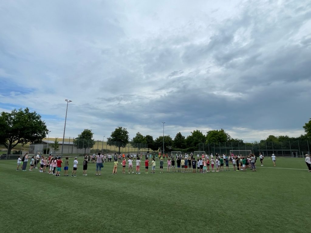 Am 21. Juni strömten die Klassen der Schwandorf-Grundschule gemeinsam mit ihren Riegenführer:innen bei bedecktem Himmel auf den Kunstrasenplatz, auf welchem die Sportlehrerinnen bereits die Stationen zum Sprinten, ausdauernd Laufen, Werfen und Springen aufgebaut hatten.