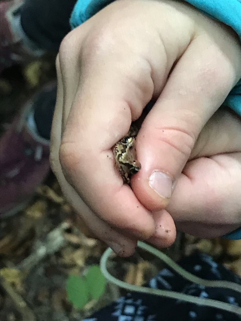 Danach wurden Bäume und alles was dazu gehört etwas genauer unter die Lupe genommen, interessante Sachen zum Thema Eichhörnchen gelernt, jeder durfte einen Kobel bauen und nicht zuletzt sich blind am Seil entlangtasten. Das war spannend. Ein Frosch und ein Hund waren auch dabei.